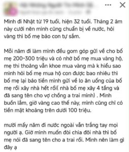 Theo chia sẻ, trong suốt 13 năm làm việc tại Nhật Bản, mỗi năm T. đều gửi về cho bố mẹ từ 200–300 triệu đồng, tổng số tiền gần 4 tỷ đồng. Anh nhờ bố mẹ mua vàng tích trữ giúp để làm vốn sau này cưới vợ, ổn định cuộc sống.
