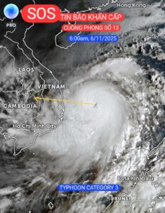 Theo chuyên gia dự báo thời tiết Huy Nguyễn, vào lúc 6 giờ sáng nay (6/11), bão số 13 – Kalmaegi đang ở cấp cuồng phong (Typhoon Category 3), với sức gió mạnh cấp 14, giật cấp 17, cách bờ biển Quy Nhơn (Bình Định) khoảng 330 km về phía Đông Nam.