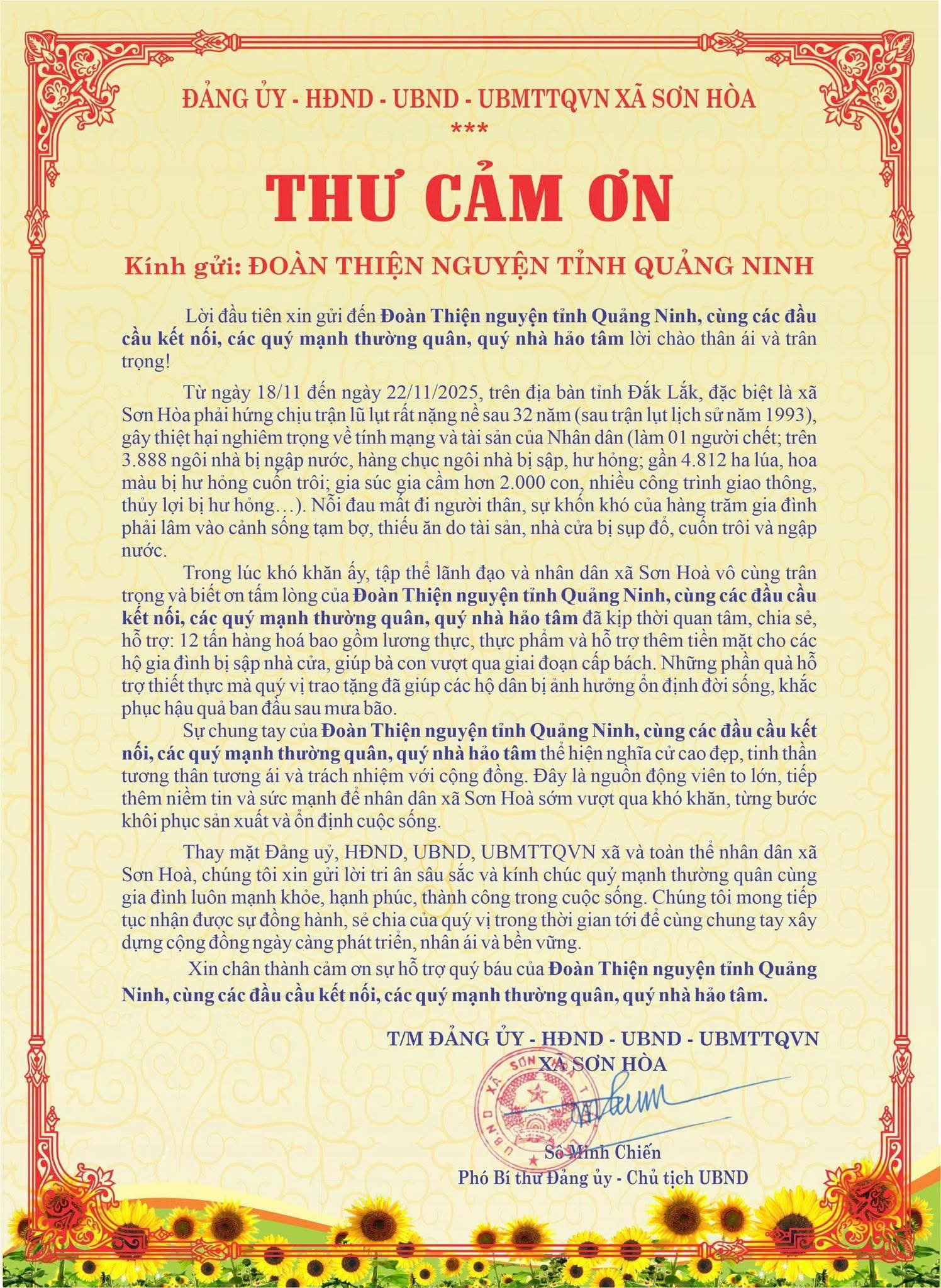 Đảng ủy, HĐND, UBND và UBMTTQ Việt Nam xã Sơn Hòa gửi lời cảm ơn sâu sắc đến tập thể những người đã chung tay vì cộng đồng, đồng thời hy vọng tiếp tục nhận được sự đồng hành của các tổ chức, cá nhân trên cả nước trong hành trình giúp người dân khắc phục hậu quả thiên tai và xây dựng cuộc sống ổn định, bền vững hơn.
