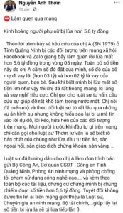Chia sẻ từ luật sư Nguyễn Anh Thơm: một vụ lừa đảo qua mạng xã hội vừa xảy ra tại Quảng Ninh khiến một phụ nữ (chị A, SN 1979) mất hơn 5,6 tỷ đồng chỉ trong 5 ngày.