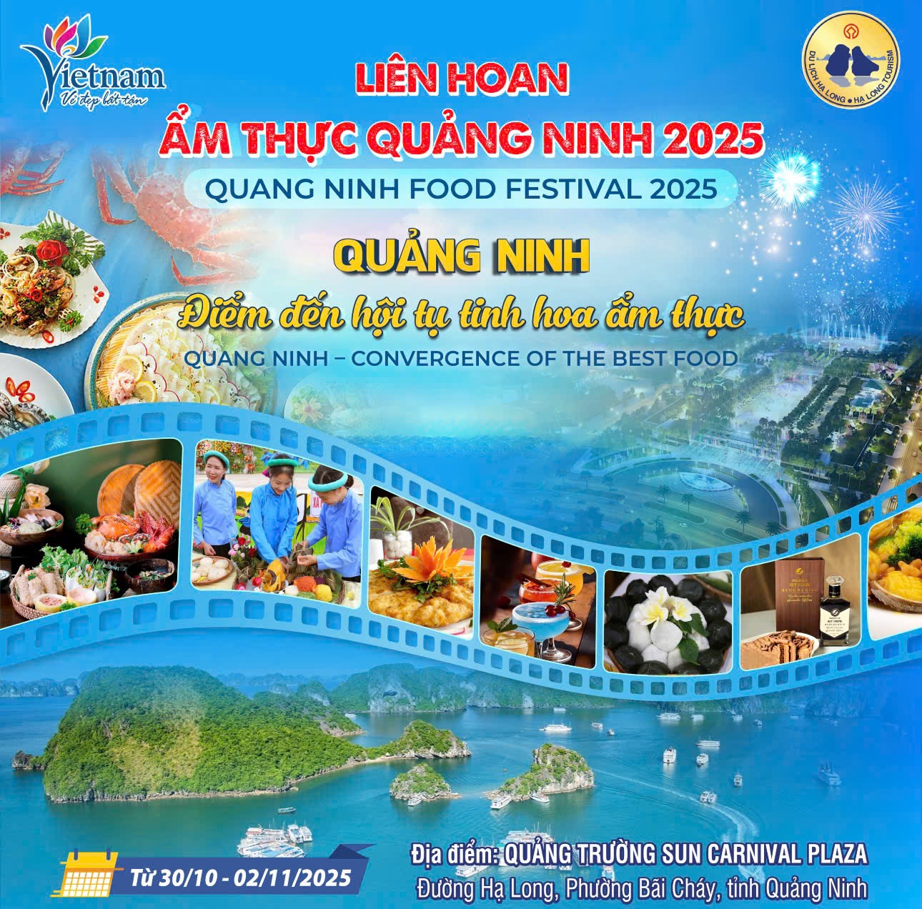 Liên hoan Ẩm thực Quảng Ninh 2025 với chủ đề “Quảng Ninh – Điểm đến hội tụ tinh hoa Ẩm thực” sẽ diễn ra từ ngày 30/10 đến 02/11/2025 tại Quảng trường Sun Carnival, phường Bãi Cháy, TP Hạ Long. Sự kiện do Sở Văn hóa, Thể thao và Du lịch Quảng Ninh chủ trì, quy tụ khoảng 200 gian hàng trong nước và quốc tế.