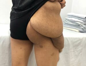 Qua thăm khám, các bác sĩ xác định khối u lan rộng toàn bộ vùng mông phải, kéo dài xuống khoảng 2/3 đùi, kèm theo tình trạng da giãn, chảy xệ và thay đổi sắc tố. Bệnh nhân được chẩn đoán u xơ thần kinh khổng lồ và chỉ định phẫu thuật.