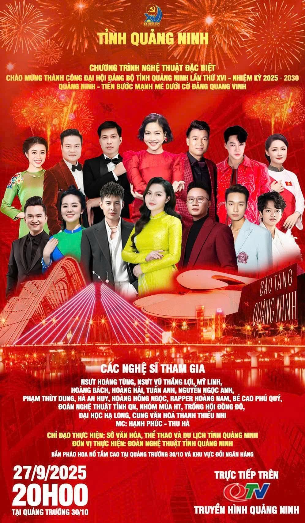 Tối 27/9, tại Quảng trường 30/10 (phường Hạ Long, TP Hạ Long), tỉnh Quảng Ninh sẽ tổ chức chương trình nghệ thuật đặc biệt với chủ đề “Quảng Ninh – Tiến bước mạnh mẽ dưới cờ Đảng quang vinh”, chào mừng Đại hội Đảng bộ tỉnh lần thứ XVI.