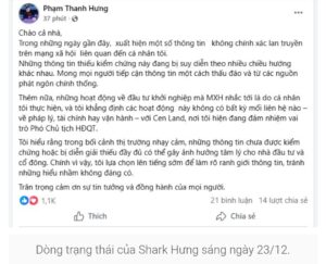Sáng 23/12, trên trang Facebook cá nhân, ông Phạm Thanh Hưng (Shark Hưng) đã đăng tải dòng trạng thái liên quan đến những thông tin, tin đồn đang lan truyền về cá nhân ông trên mạng xã hội trong thời gian gần đây.