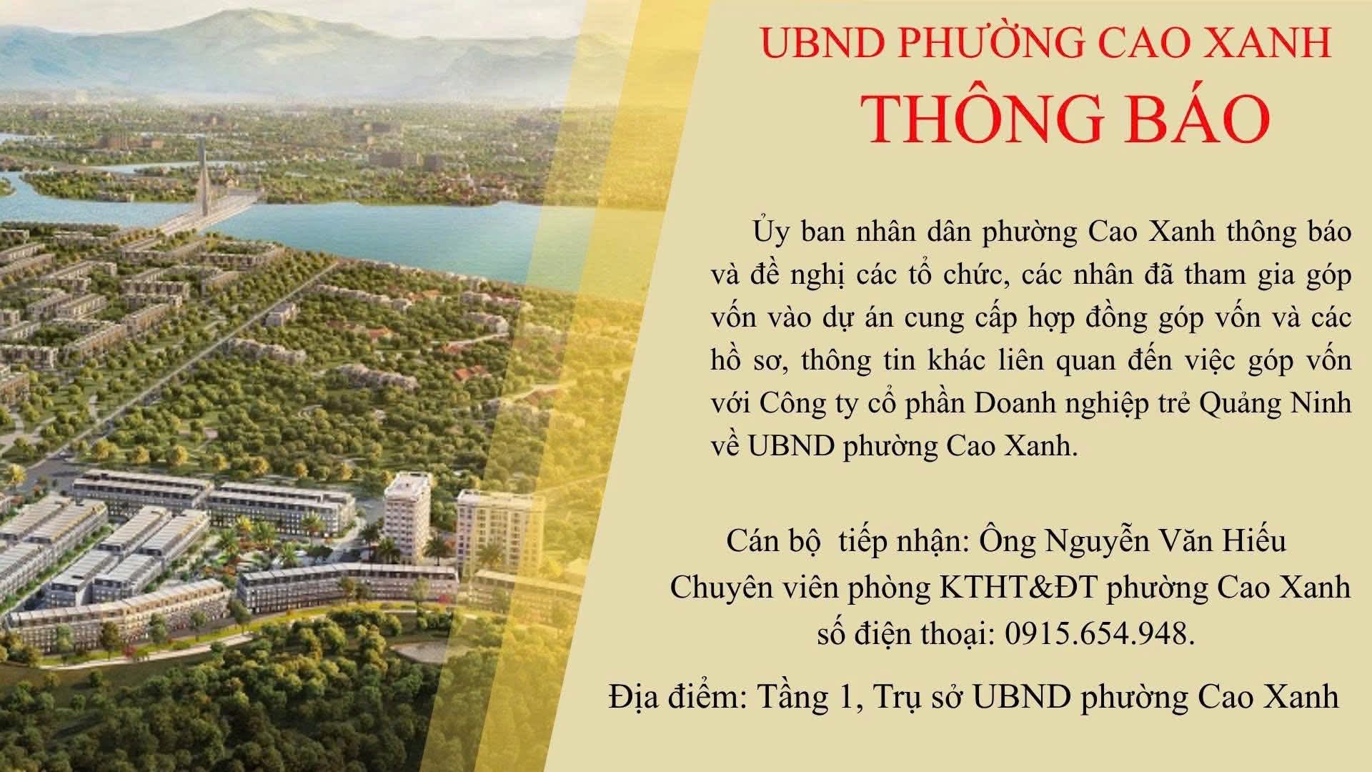 Dự án Khu đô thị mới Đồi Chè do Công ty Cổ phần Doanh nghiệp trẻ Quảng Ninh làm chủ đầu tư. UBND phường đề nghị các tổ chức, cá nhân đã góp vốn vào dự án cung cấp hợp đồng góp vốn cùng các hồ sơ, tài liệu liên quan để phục vụ công tác tổng hợp, rà soát.