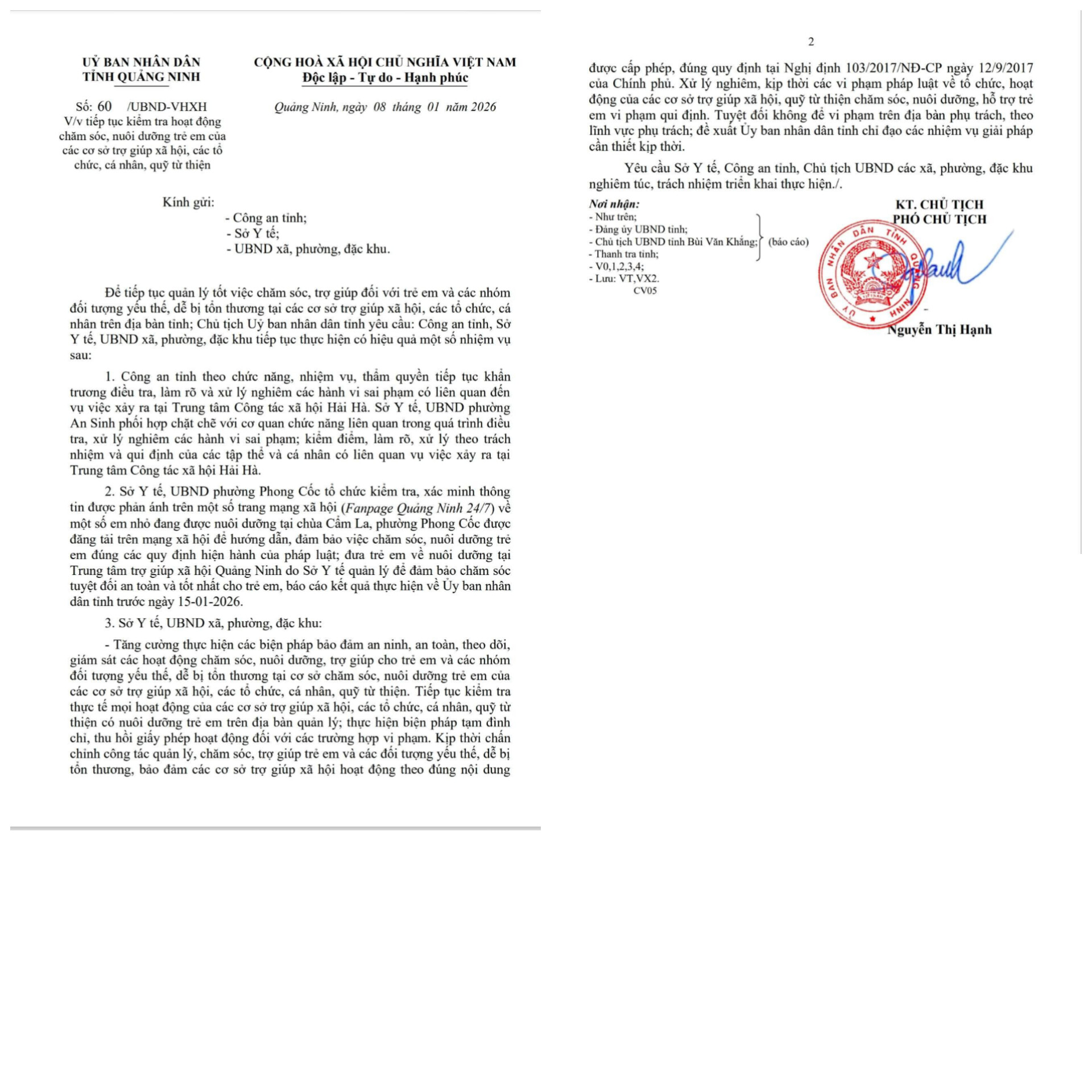 Đối với thông tin phản ánh trên mạng xã hội về việc nuôi dưỡng trẻ em tại chùa Cẩm La (phường Phong Cốc), UBND tỉnh giao Sở Y tế và UBND phường Phong Cốc tổ chức kiểm tra, xác minh, hướng dẫn việc chăm sóc, nuôi dưỡng trẻ em đúng quy định pháp luật. Trường hợp cần thiết, đưa trẻ em về nuôi dưỡng tại Trung tâm Trợ giúp xã hội Quảng Ninh do Sở Y tế quản lý để bảo đảm an toàn và điều kiện chăm sóc tốt nhất; báo cáo kết quả về UBND tỉnh trước ngày 15/01/2026.